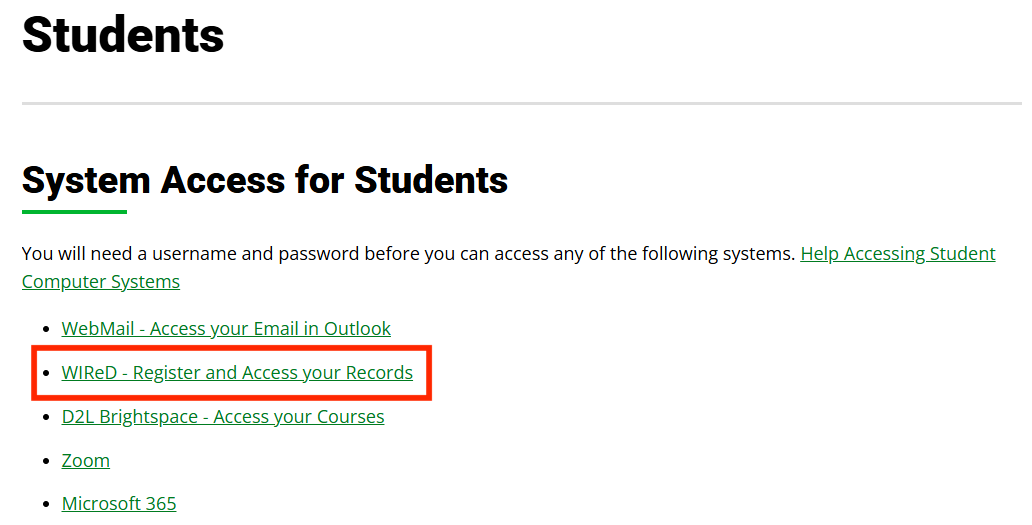 3. Under "System Access for Students" select WIReD - Register and Access your Records.
